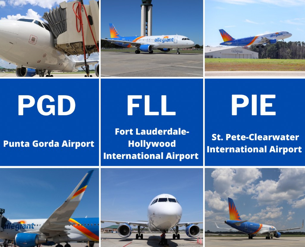 Allegiant begins service to three new routes: Punta Gorda/Fort Meyers, FL (PGD), Fort Lauderdale/Miami, FL (FLL), and St. Pete/Tampa, FL (PIE).